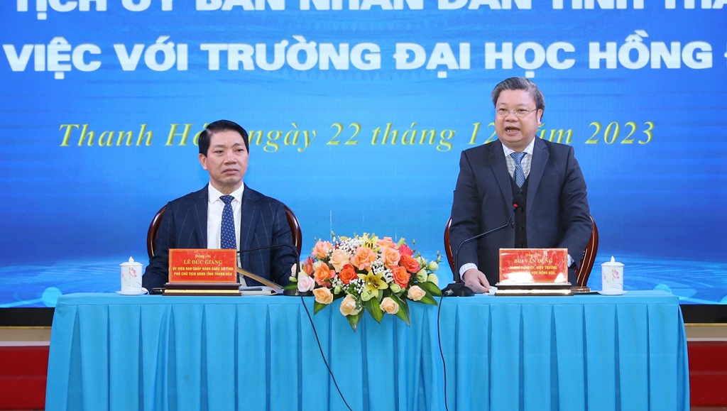Phát biểu kết luận buổi làm việc, Phó Chủ tịch UBND tỉnh Lê Đức Giang biểu dương, ghi nhận, đánh giá cao kết quả đạt được của trường Đại học Hồng Đức trong năm qua trên các mặt hoạt động. Đồng thời nhấn mạnh: Để trường Đại học Hồng Đức trở thành trung tâm nghiên cứu đổi mới sáng tạo của tỉnh, của khu vực, trong nước và quốc tế, trong thời gian tới nhiệm vụ đặt ra là hết sức nặng nề. Hiện thực hóa mục tiêu này phụ thuộc vào nhiều yếu tố, trong đó cần có sự nỗ lực, cố gắng rất lớn từ phía nhà trường.