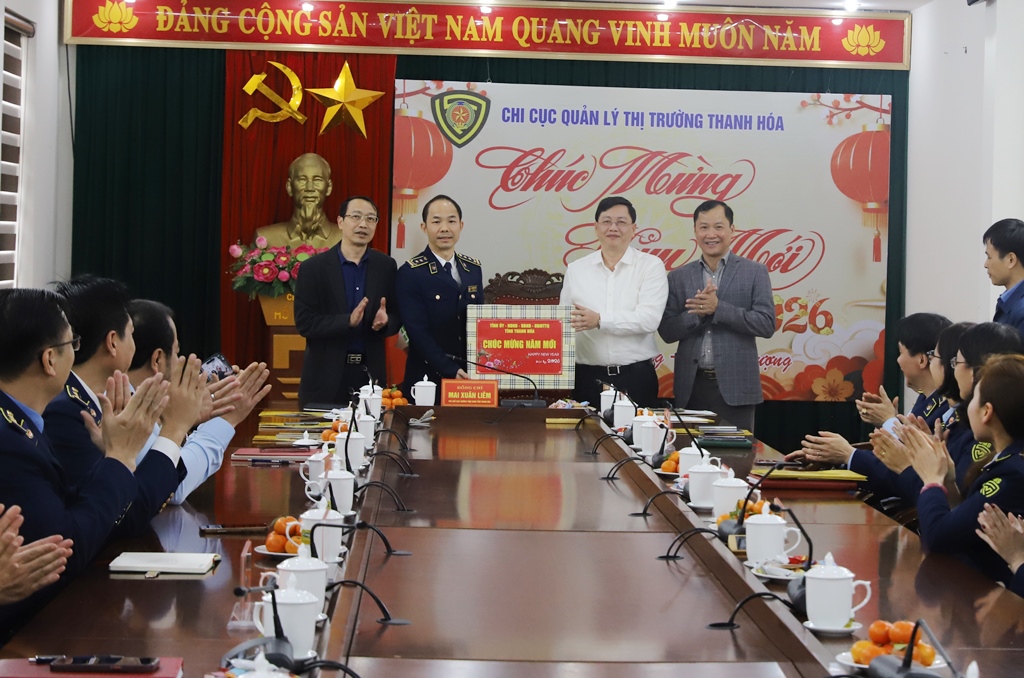 Tại Chi cục Quản lý thị trường Thanh Hóa, Phó Chủ tịch Thường trực UBND tỉnh đề nghị đơn vị tiếp tục bám sát diễn biến cung - cầu, tăng cường kiểm tra, kiểm soát thị trường trước, trong và sau Tết; kiên quyết đấu tranh với buôn lậu, gian lận thương mại, hàng giả, đầu cơ găm hàng, nâng giá bất hợp lý các mặt hàng thiết yếu; đặc biệt là các mặt hàng thực phẩm có nhu cầu tiêu thụ cao trong dịp Tết.