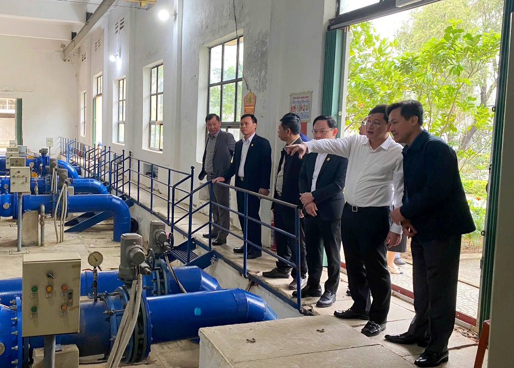 | Phó Chủ tịch Thường trực UBND tỉnh và đoàn công tác tham quan hệ thống xử lý nước tại Công ty Cấp nước Thanh Hóa. |