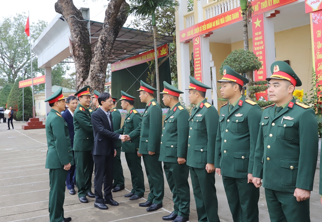 Nhân dịp chuẩn bị đón Tết Nguyên đán Bính Ngọ 2026; đoàn cũng đã đến thăm, chúc Tết, tặng quà cán bộ, chiến sĩ Tiểu đoàn 40, Trung đoàn 762, Bộ CHQS tỉnh Thanh Hóa. Qua nghe báo cáo của Trung đoàn về kết quả thực hiện nhiệm vụ năm 2025 và công tác sẵn sàng chiến đấu, chuẩn bị đón Tết Nguyên đán. Phó Chủ tịch UBND tỉnh Đầu Thanh Tùng chúc mừng và đánh giá cao những kết quả đơn vị đã đạt được. Đồng chí cũng thông tin đến cán bộ, chiến sĩ Tiểu đoàn 40, Trung đoàn 762 những kết quả nổi bật trong phát triển kinh tế - xã hội, đảm bảo quốc phòng - an ninh của tỉnh năm 2025.