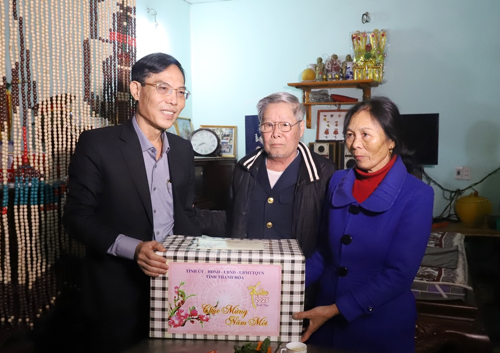 | Phó Chủ tịch UBND tỉnh Đầu Thanh Tùng thăm hỏi, trao quà cho bệnh binh Lê Hùng Vương (thôn Thượng Đình 1, xã Lưu Vệ). |