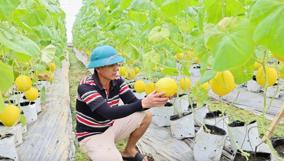 Dưa Kim Hoàng Hậu được chăm sóc trong nhà màng theo quy trình VietGAP tại HTX dịch vụ nông nghiệp Thiệu Hưng, xã Thiệu Hóa.